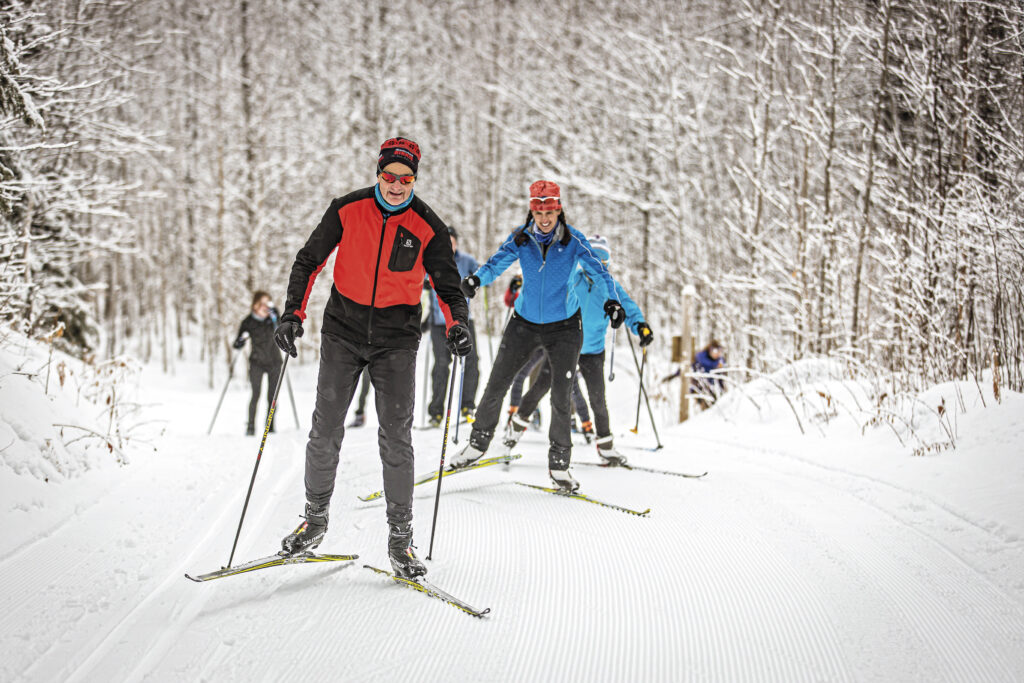 Escape to a winter paradise where 23 kilometers (13+ miles) of professionally groomed trails meander through stunning maple, pine, and aspen forests, offering the perfect Nordic getaway. Groomed for both classic and skate skiing, the beautiful rolling terrain is perfectly designed to challenge and delight skiers of all levels.